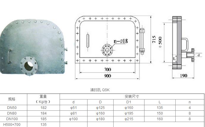 GSQ清掃孔裝于重質油罐底部,清掃油罐進要放出污水及掃除罐內污泥,其中GSQ-50A、GSQ-80B、GSQ-100C,帶有放水管,出廠時不供應孔頸及加強板。